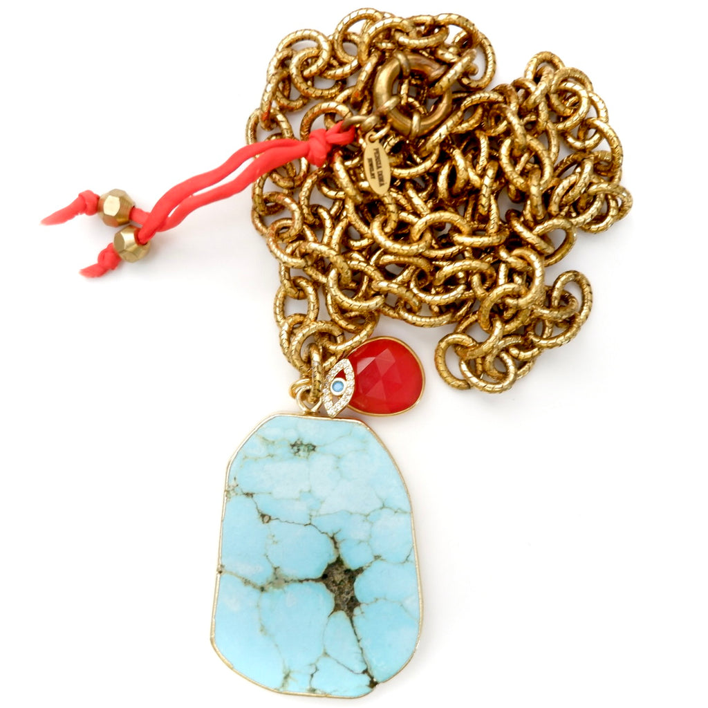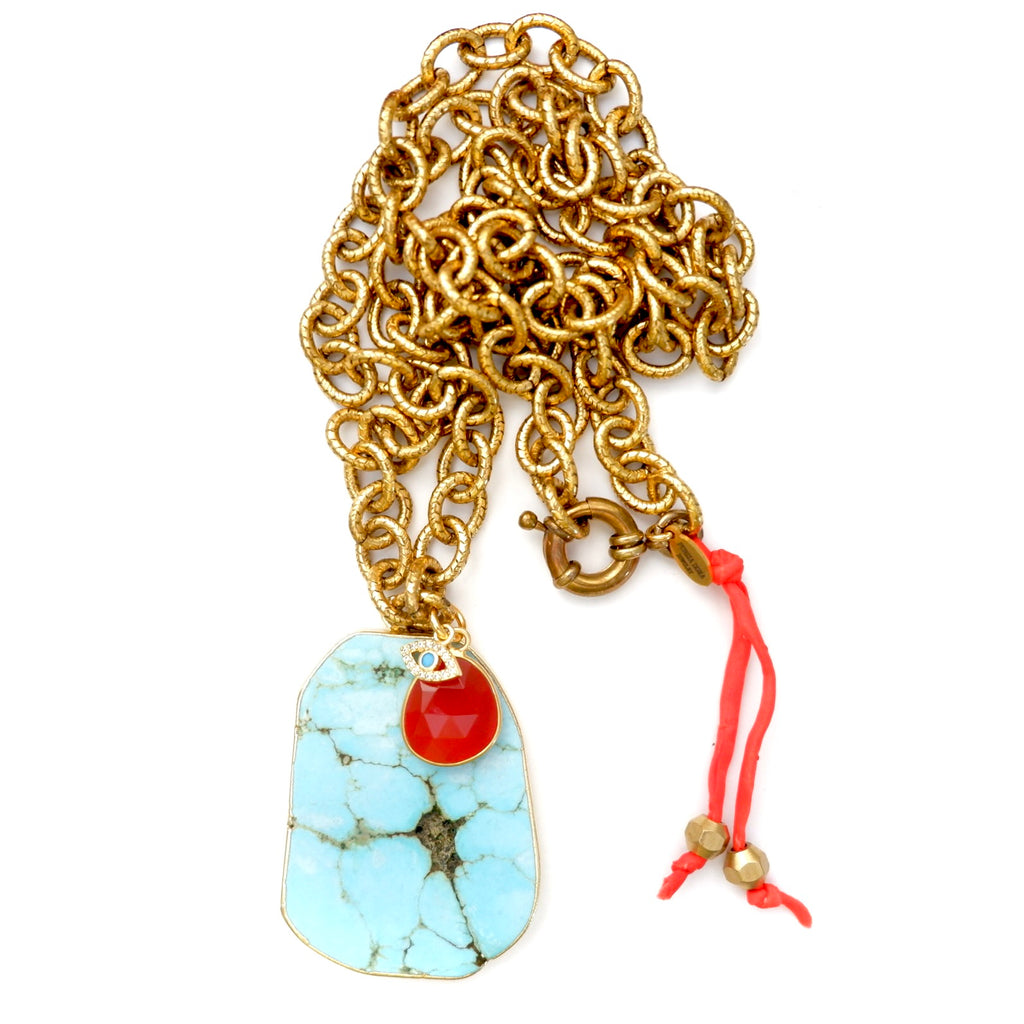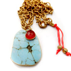 Handcrafted one-of-a-kind necklace, vintage turquoise howlite large pendant, a smaller cornelian gemstone pendant and a tiny little evil eye charm, on a vintage etched gold brass chain finished with a vintage clasp and hand-painted silk ribbon with vintage danglers. Wear this truly one-of-a-kind showstopper casually with jeans and a t-shirt or dressed up.